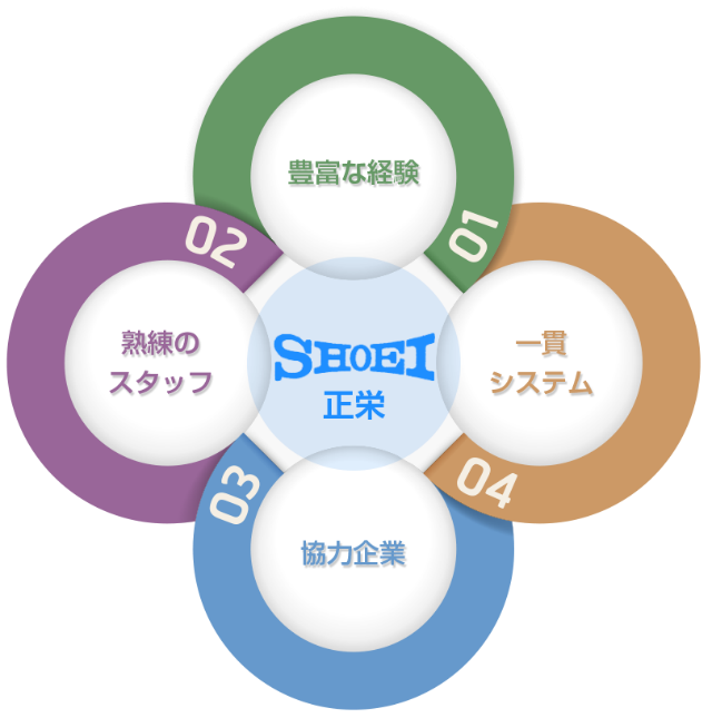 輸出入貨物、関連貨物の各物流分野のスペシャリストが集まり創業した正栄株式会社。時代とともに複雑化、細分化する物流業界において、専門分野を熟知したそれぞれのスキルと経験を基礎に、ネットワークを広げ、お客様の信頼をさらに上回る満足度で応えます。