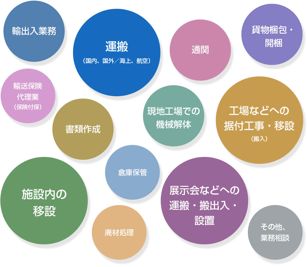 事業概要 業務内容 よくある質問 業務内容 お客様それぞれのご希望に合わせて、最適な提案で信頼にお応えします。 輸出入業務、運搬(国内、国外/海上、航空)、通関、貨物梱包・開梱、工場などへの据付工事・移設(搬入)、展示などへの運搬・搬出入・設置、施設内の移設、書類作成、輸送保険代理業(保険付保)、倉庫保管、廃材処理、その他業務相談 事業概要➡︎ よくある質問➡︎